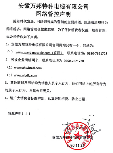 鄭重聲明:安徽萬邦特種電纜有限公司官方網站為:www_wanbangcable_com.gxnnlxzs.com,除此之外無任何子網站或合作網站,其余均為假冒偽劣。電話:0550-7621728 13485756353 地 址:安徽省天長市滁州高新技術產業開發區經四路29號